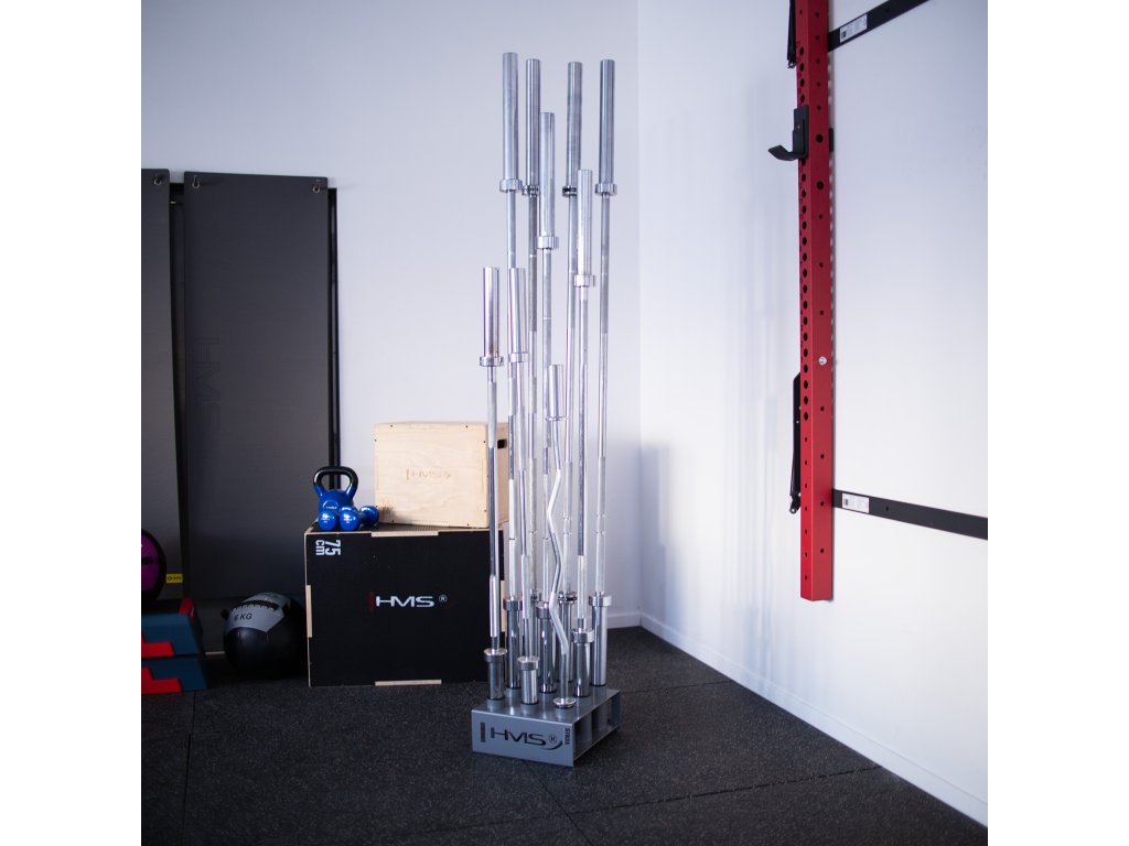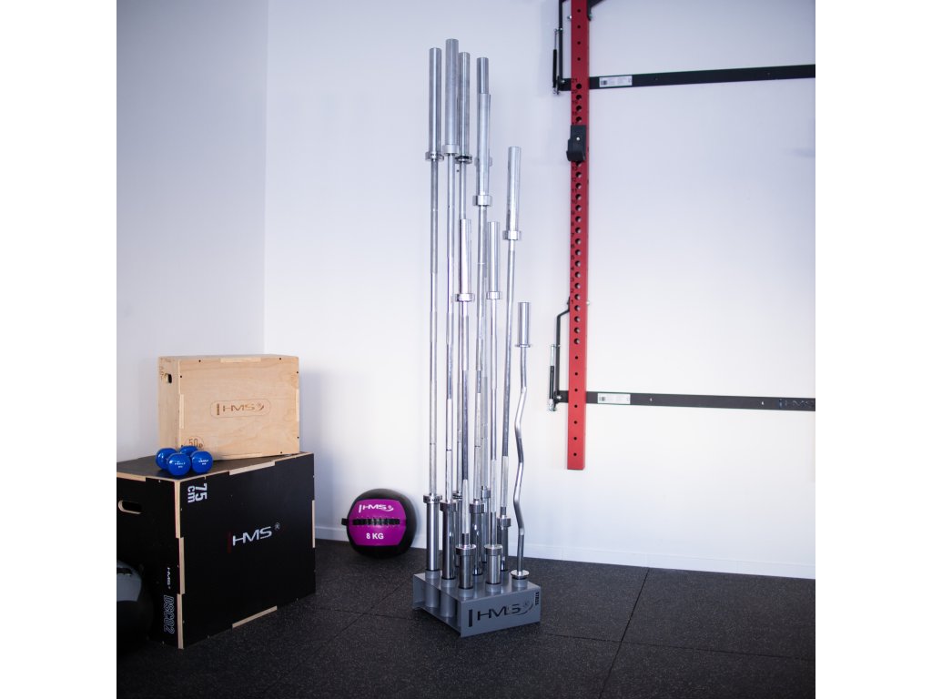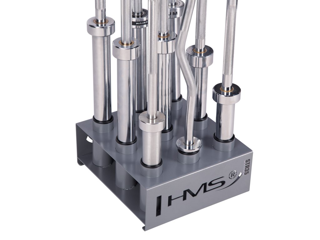 Stojan na olympijské osy STR35 od společnosti HMS vám ušetří spoustu místa ve vašem tréninkovém prostoru. Umožňuje postavit devět os vedle sebe ve svislé poloze.