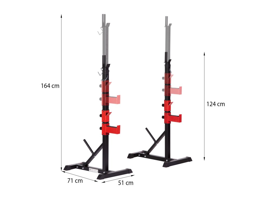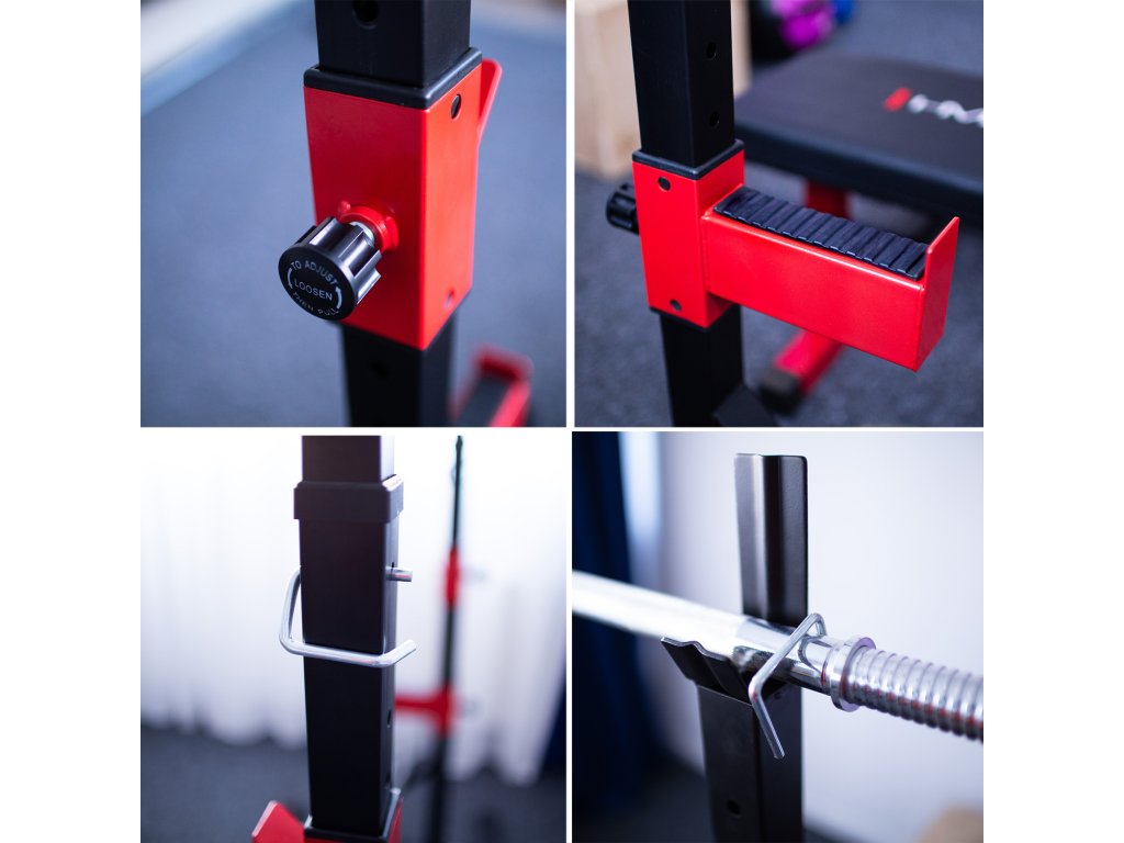 Výrobek má také úchyty, do kterých můžete uložit činku. První úchyt je umístěn na výsuvné tyči, zatímco druhý lze posouvat po spodní části rámu. Úchyty jsou profilované, aby zabránily sklouznutí činky.