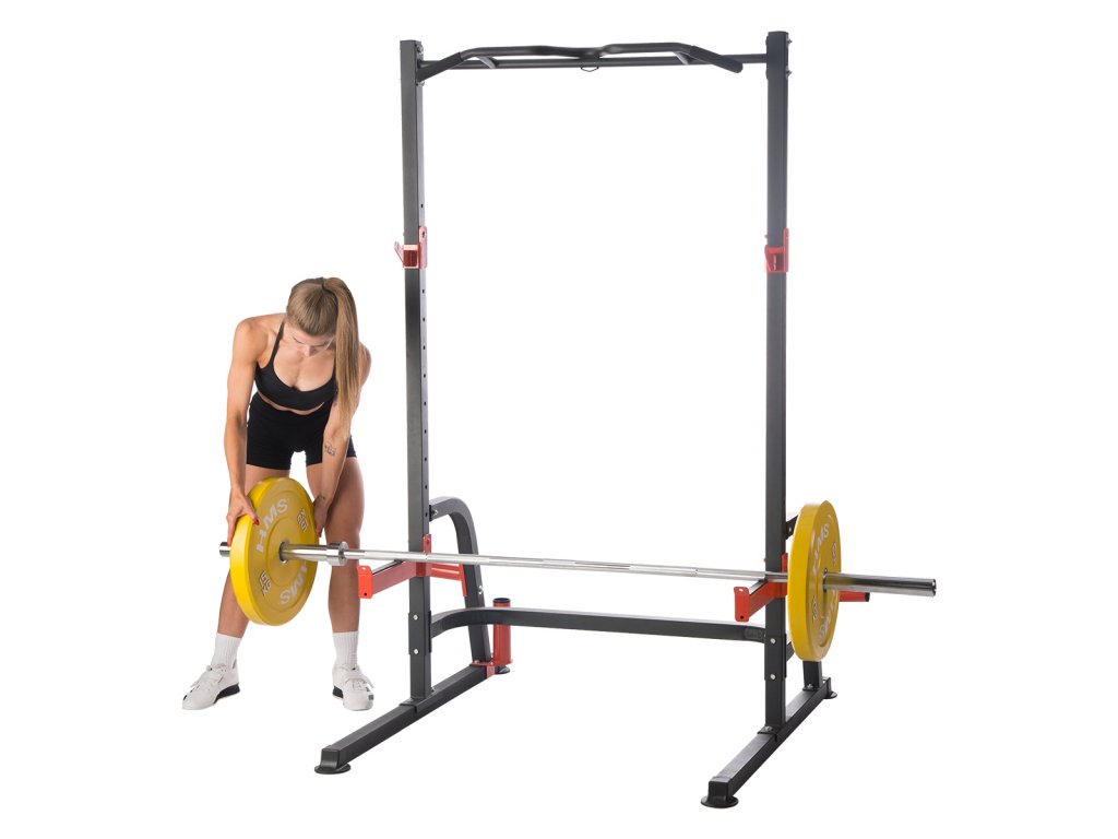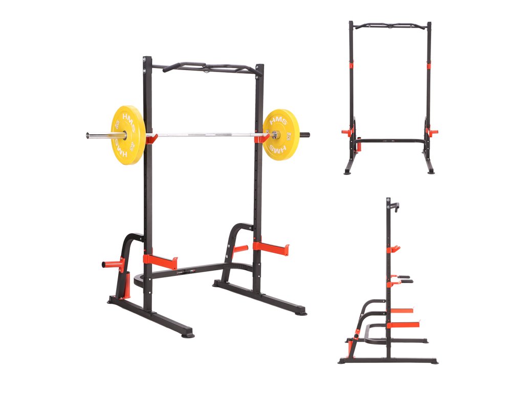 HMS PWS08 je multifunkční tréninkový stojan s držákem na velkou činku a bezpečnostními háky na zavěšení, díky nimž můžete bezpečně a samostatně provádět silový trénink s přídavnou zátěží, zatímco hrazdu a podpěry lze použít pro kalistenický trénink, tj. s využitím váhy vlastního těla. Stojan lze použít i při cvičení s posilovací lavicí. Podpěry, držáky na činky a jistící háky jsou výškově nastavitelné do 14-ti úrovní.