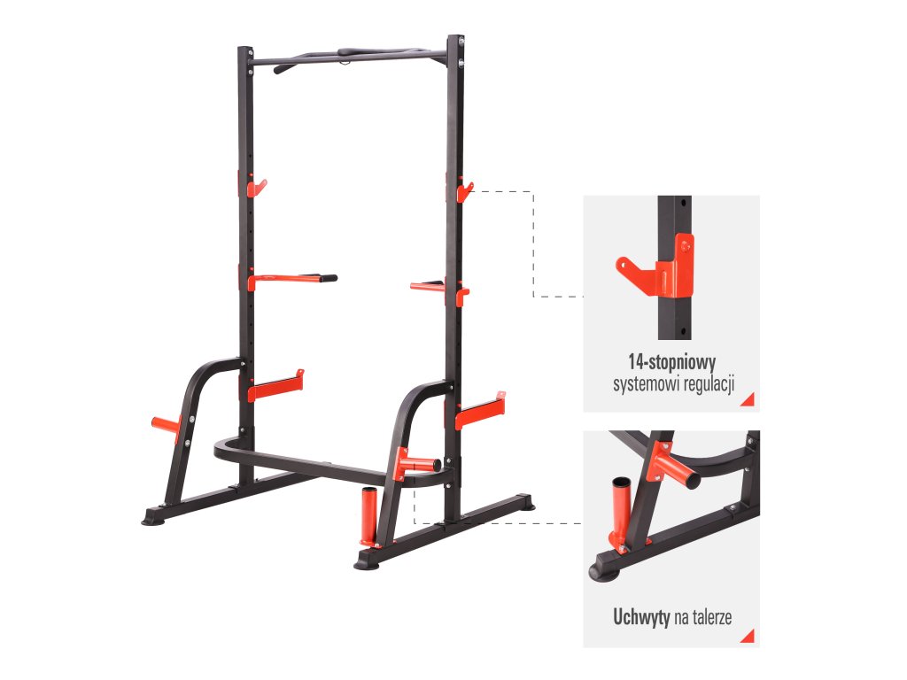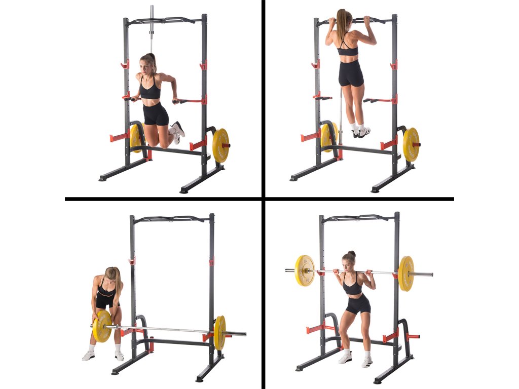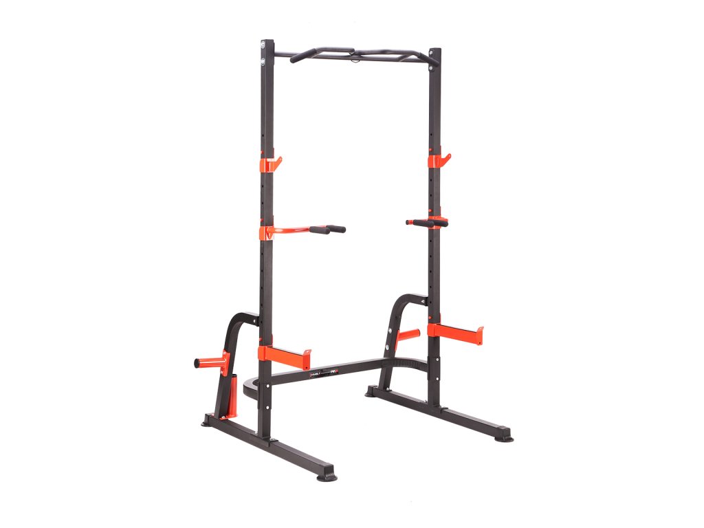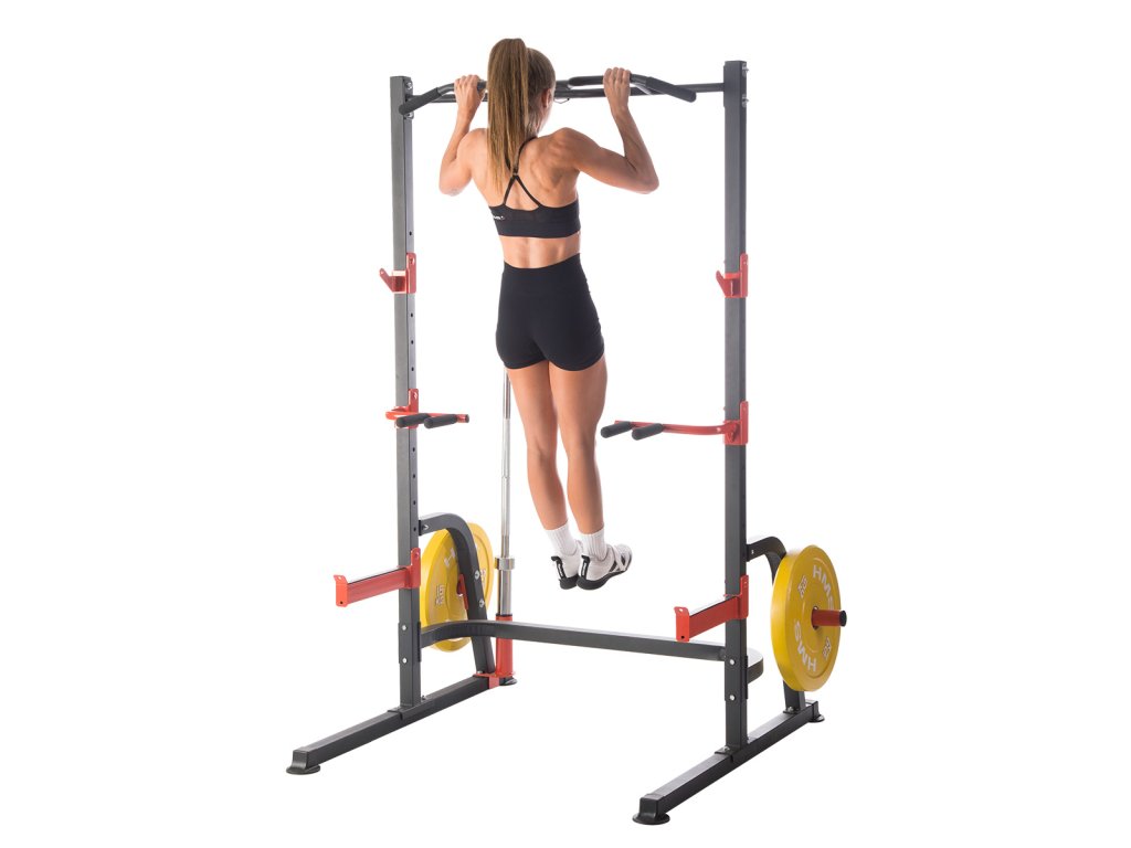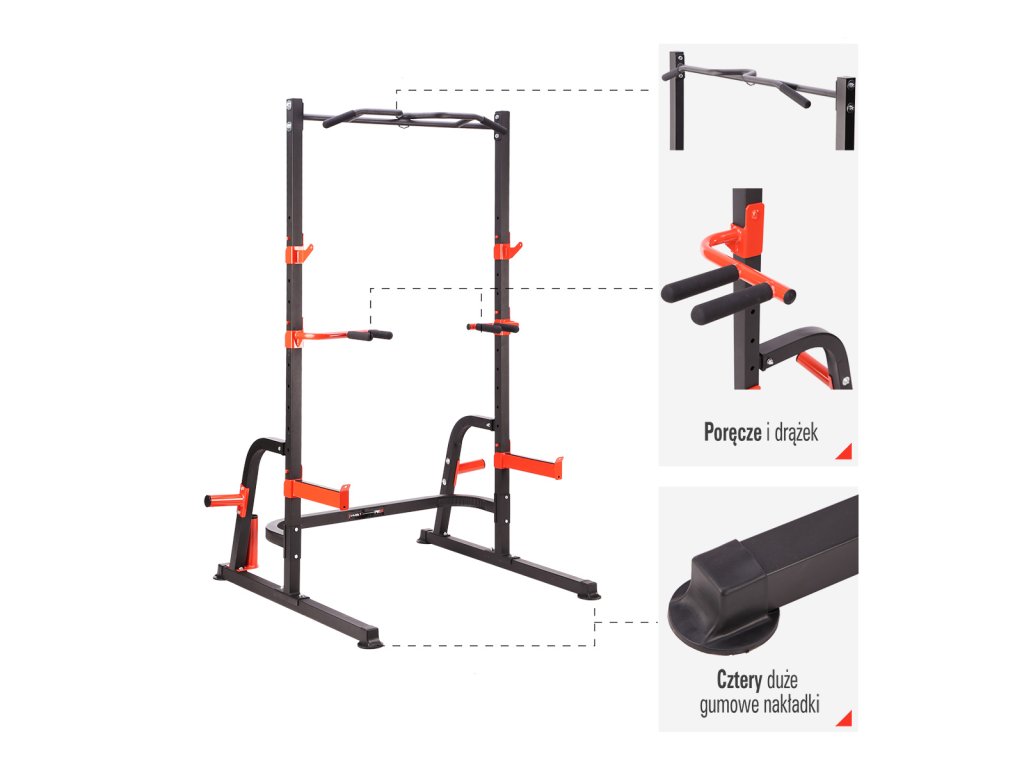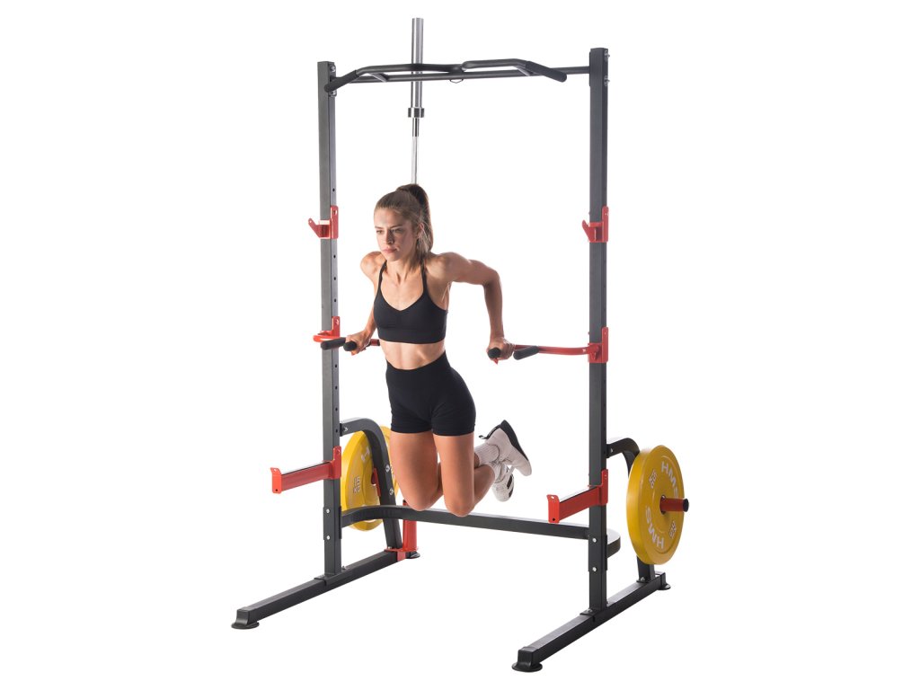 Celá konstrukce je vyrobena z oceli, díky čemuž je trvanlivá a odolná, rozměrná základna umožňuje dynamický trénink i při velkém zatížení. Maximální nosnost stojanu je 200 kg. Volné závaží je možné odkládat na 2 trny o délce 16 centimetrů. Podpěry pro dipy mají dvojitá madla a umožňují přizpůsobení správné polohy pro trénink. Tvarovaná hrazda nabízí 4 páry různých úchopů. Stabilizátory jsou osazeny koncovkamy, které chrání konstrukci a podlahu před poškozením a zároveň zvyšují stabilitu stojanu.