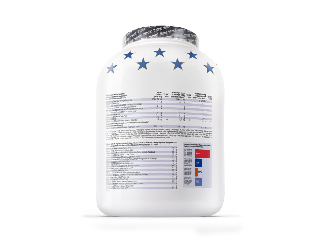 Výživové složení/nutriční hod.: 100 g/30 g s 300 ml polotuč. mléka/30 g s 300 ml vody: energetická hodnota: 1650 kJ/390 kcal/1089 kJ/258 kcal/495 kJ/117 kcal, bílkoviny: 82 g/35 g/25 g, sacharidy: 5,5 g/15 g/1,7 g, z toho cukr: 4,6 g/15 g/1,4 g, tuky: 4,5 g/6,1 g/1,3 g, z toho nasycené mastné kyseliny: 2,7 g/4,2 g/0,8 g, vláknina: 0,1 g/méně než 0,1 g/méně než 0,1 g, sodík: 0,35 g /0,26 g/0,11 g, vitamín B6: 2,65 mg (189% DDD)/0,93 mg (66% DDD)/0,8 g (57% DDD), vápník: 360 mg (45% DDD)/468 mg (59% DDD)/108 mg (14% DDD), L-glutamin: 6700 mg/2000 mg/2000 mg. Energetická hodnota ve 100 ml nápoje s polotuč. mlékem: 340 kJ/81 kcal. Energetická hodnota ve 100 ml nápoje s vodou: 155 kJ/37 kcal. Aminokyselinový profil (ve 100 g): L-isoleucin: 7,1 g, L-leucin: 11,3 g, L-lysin: 9,1 g, L-methionin: 2,1 g, L-fenylalanin: 2,8 g, L-treonin: 6,4 g, L-tryptofan: 1,3 g, L-valin: 6,6 g, L-arginin: 2,0 g, L-cystein: 2,1 g, L-histidin: 1,6 g, L-tyrosin: 2,5 g, L-alanin: 4,8 g, kyselina L-asparagová: 9,2 g, L-glutamin: 6,7 g, kyselina L-glutamová: 14,5 g, L-glycin: 1,3 g, L-prolin: 4,3 g, L-serin: 4,3 g. Aminokyselinové frakce: Beta-laktoglobulin: 46%, alfa-laktoglobulin: 16%, immunoglobulin G: 2%, glykomakropeptidy: 26%. *DDD = % NRV (percentuální vyjádření denní referenční hodnoty příjmu pro dospělého jedince). Alergeny: mléko a jeho deriváty.