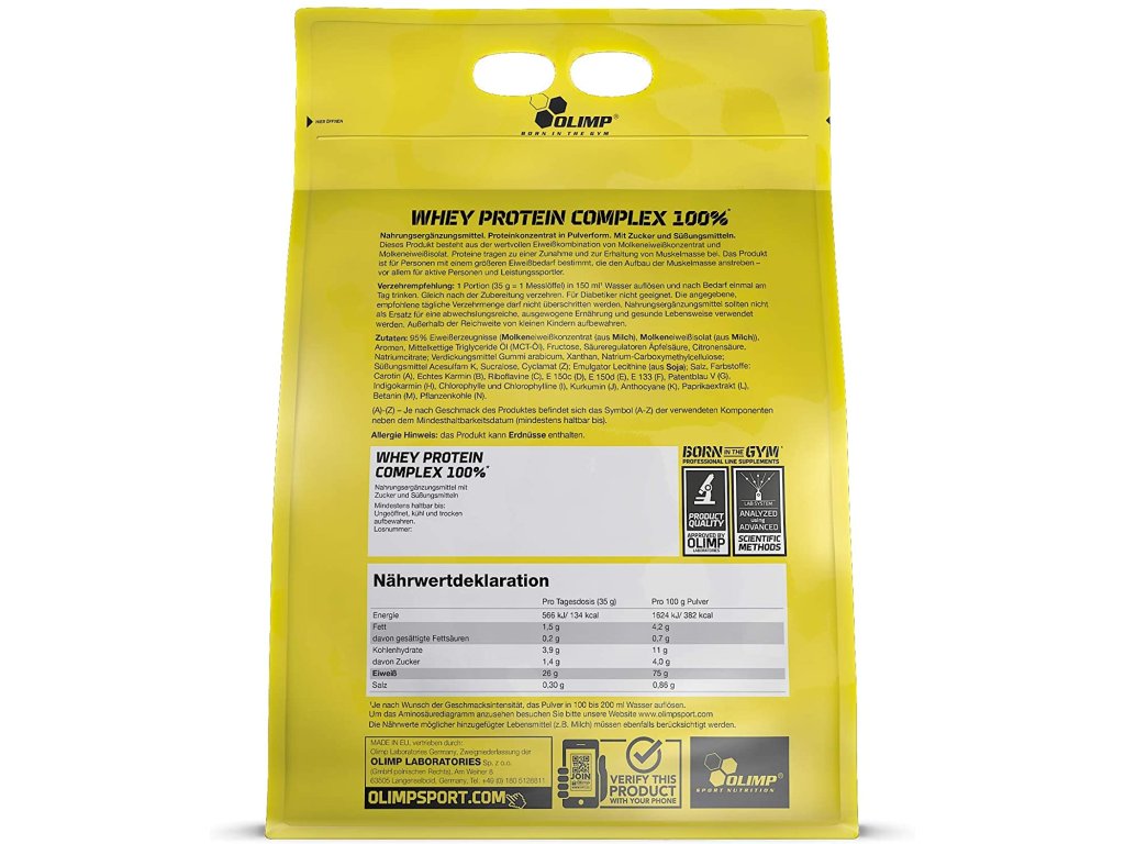 WHEY PROTEIN COMPLEX 100%: doplněk stravy. Určen pro fyzicky aktivní zdravé jedince a pro sportovce. Obsahuje směs kvalitních syrovátkových bílkovin (s vysokou biologickou hodnotou) ve formě koncentrátu a izolátu, dále minimum sacharidů a tuků. Se sladidly. Bílkoviny přispívají k udržení svalové hmoty a normálního stavu kostí. Upozornění: doplněk nenahrazuje vyváženou a různorodou stravu, která je pro správné fungování organismu nezbytně důležitá. Produkt je určen dospělým sportovcům. Doporučená denní dávka: 1-3 porce, ráno před snídaní, pak mezi jídly a po tréninku nebo před spaním. Porce:35g(1odměrka)-rozmíchejte se 150ml vody, případně se 100-200ml, v závislosti na chuťových preferencích. Dodržujte pitný režim. Nepřekračujte doporučenou denní dávku. Neurčí-li lékař jinak, není určeno dětem, těhotným a kojícím ženám a lidem trpícím závažnými onemocněními, či přecitlivělostí na některou ze složek přípravku. Není určeno pro diabetiky! Zkonzumujte ihned po přípravě! Skladujte v uzavřeném balení na chladném, suchém a temném místě, mimo dosah dětí. Info o výrobku:e-shop FIT-PRO CZECH s.r.o., info@fit-pro.cz, www.fit-pro.cz. Složení výrobku: 95%bílkovinná směs(ultrafiltrovaný syrovátkový protein-kon-centrát WPC(z mléka), syrovátkový protein-izolát WPI-CFM®(z mléka)),aromata, fruktóza, regulátory kyselosti: kyselina jablečná (E296), kyselina citrónová(E330)-pro všechny příchutě jahoda, zahušťující látky: arabská guma(E414), xanthanová guma(E415), karboxymethylcelulóza sodná(E466), sladidla: acesulfam K(E950),sukralóza(E955),cyklamáty(E952),emulgátor: sojový lecitin(E322);sůl (pro všechny čokoládové příchutě),barviva:karmíny(E120) pro příchutě: jahoda, třešeň, jahoda-kiwi, banán-třešeň, dále: amoniakový karamel(E150c) pro příchutě: sušenky-krém, karamela, čokoláda, káva, ledová káva, lískový oříšek, tiramisu a kapučíno, dále:riboflavin(E101),brilantní modř(E133) pro všechny příchutě pistácie.Výživové složení:1porce(35g)/3porce(105g)/100g: energetická hodnota: 566kJ/134 kcal/1698kJ/401kcal/1624kJ/382kcal,tuk:1,5g/4,4g/4,2g,z toho nasycené mastné kyseliny:<0,5g/0,7 g/0,7g, sacharidy:3,9g/11,6g/11g, z toho cukr:1,4g/4,2g/4g, bílkoviny:26g/79g/75g, sůl:0,3g/0,9g/ 0,86g. Aminokyselinový profil: www.olimp-supplements.com. Balení: 2,27kg,5lbs. Příchuť: SUŠENKY -SMETANA. Alergeny: mléko, soja a jejich deriváty. *Uvedené nutriční hodnoty platí pro dávkování s vodou, ostatní nutrienty (např. mléko) tyto hodnoty změní. Výrobce: OLIMP LABORATORIES Sp. z o.o., PL-39-200 Dębica, Nagawczyna 109 c, Polsko. Minimální trvanlivost do a číslo šarže: bok/dno balení. Dovoz/prodej: FIT-PRO CZECH s.r.o., Jaurisova 515/4, Praha 4, 140 00, Czech Republic.