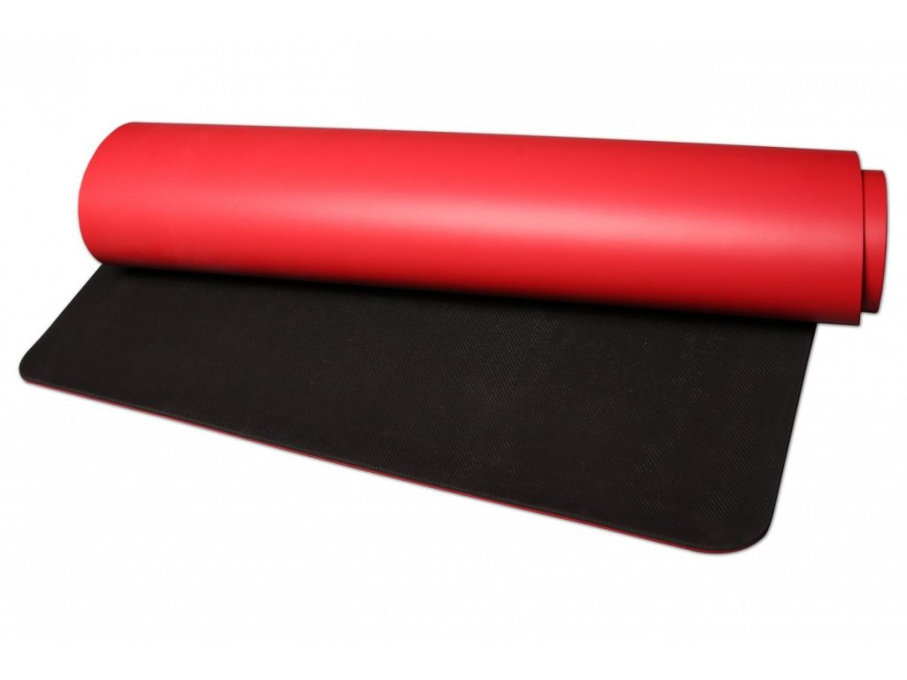 Recyklovatelná jógová podložka z přírodní gumy s povrchem na dotek připomínající umělou kůži.